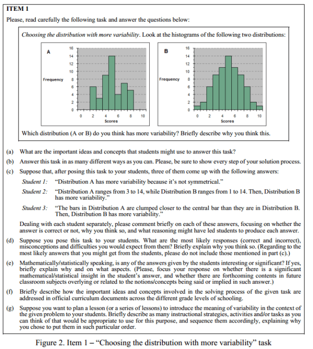 Came across this neat little tool in an article about the teaching of variability in a statistical literacy course. It’s a sample item to help a teacher think through the multiple ways that students might conceive of variability, and to what extent those conceptions either aid or block student comprehension of more complex issues: