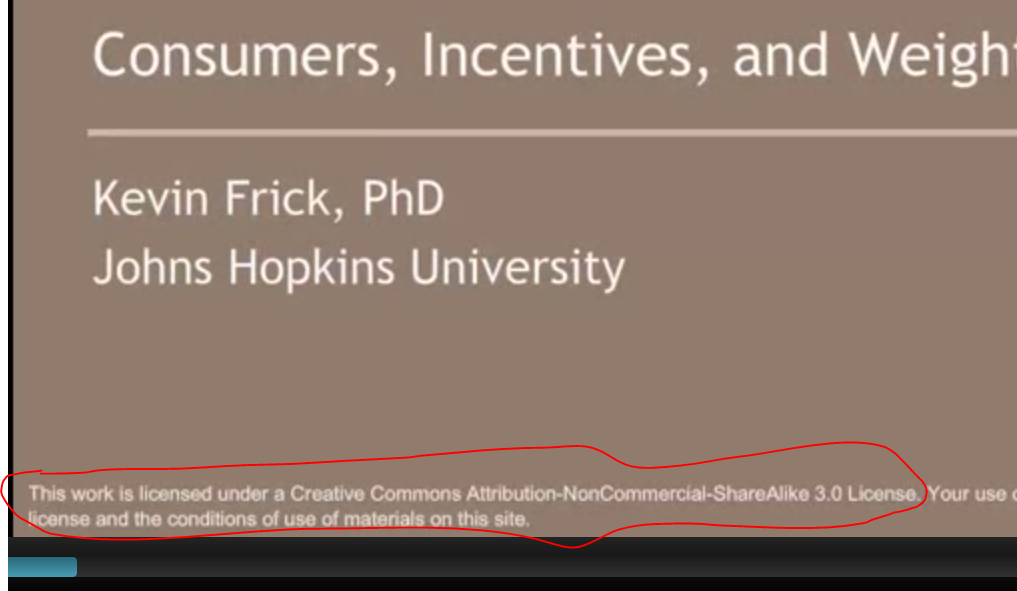 Obviously what has happened here is that Johns Hopkins and Kevin Frick have negotiated additional rights for Coursera to this OCW material, which allows them to use it commercially. Which is as it should be — that’s how CC licences are supposed to work. A CC-NC license is not a blood oath; the license holder can negotiate exceptions. In fact, that’s the point — if you’re going to use this commercially, we want a cut. Or veto power on use. Or whatever.