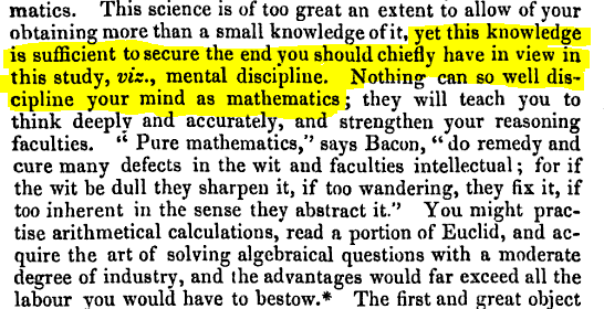 I’m not a math historian, but a quick scan through Google Books search will show you how this concept evolves. Famously, Thorndike and James execute their great transfer experiments at the turn of the century, and debunk the “mind as muscle” hypothesis. Eating math because it was good for you is no longer a valid reason.