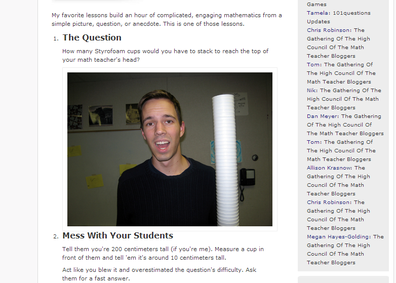 You can argue that you don’t need video to do this. I think that’s correct. Video is one way, but there are others. If you flip through Dan Meyer’s blog on math education, for example, you don’t necessarily find traditional “blended education materials”. But you *will* find a community of people designing high-impact activities for the classroom that use simple prompts. I love this activity about “stacking cups” for example: