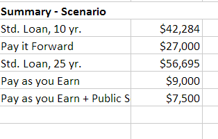 Yesterday I put together a spreadsheet and looked at two different approaches to income-based repayment — a current federal program (Pay-as-You-Earn) and Oregon’s proposed Pay it Forward. It did not end well for Pay-it-Forward, although I’m still waiting for someone more familiar with modeling these policies to pick up the torch and check/fix my models.