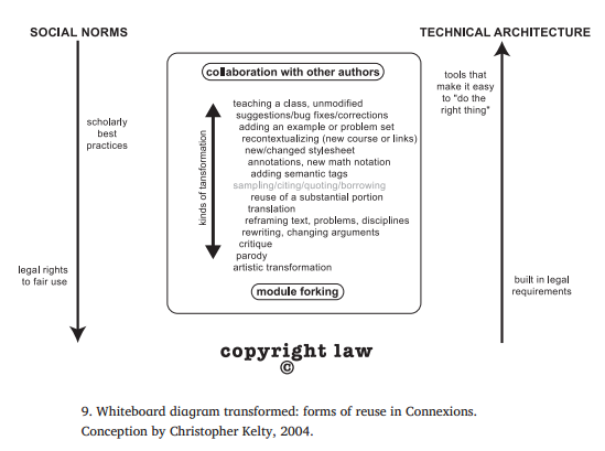 When I think about these questions, I’m always drawn back to Chris Kelty’s Two Bits. Unlike many commentators, Kelty doesn’t see a single “freedom” in free content/culture springing from abstract definition. Rather, the original example of Free Software is “modulated” into other domains, sometimes taking very different forms. But fundamental to all these modulations (including Open Education) is an idea Kelty calls a “recursive public“: