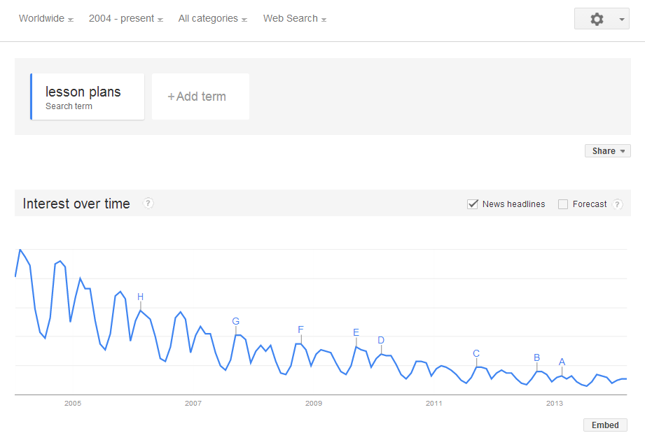 Via @fnoschese, here’s the Google Trend on searching for “Lesson Plans”