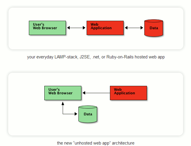 As we move from an era of browser-based web apps to one that is increasingly about client-side/server-backed apps, one of the very real concerns people have is whether hackability disappears. Unhosted is very fringe, and not exactly poised for wide adoption. But it’s a great example of how the technological shift we’re seeing can be seen as *more* empowering than what we live with now, if we chose to engage with that shift. Unhosted embraces the “one server per human” concept, but pushes the much of the functionality of these servers up to client apps written in a broswer-based, locally run javascript environment. Apart from the browser-based nature of the apps, the idea is similar to what I was discussing in my post — make the server piece dumb enough that apps using it don’t need special server code. The server, in this case, is just a big dumb resource, like a hard drive, CPU, etc. It doesn’t need to know what app you are running any more than your RAM needs to know you are running Microsoft Word or Reason 7.