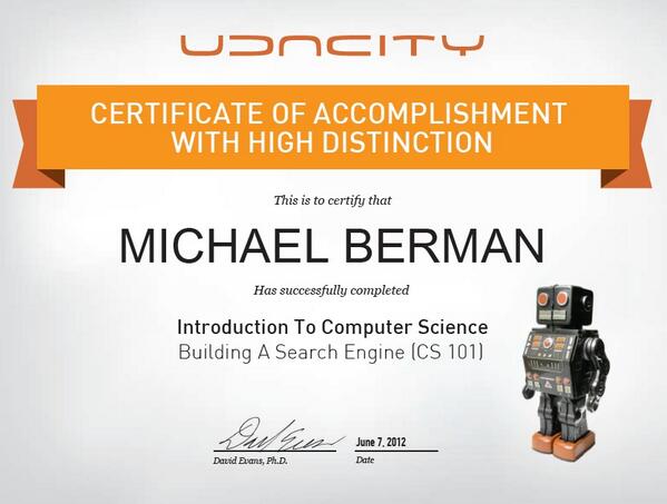 Nice work on earning a certificate for the Intro to Computer Science courseware. It speaks volumes for what you learned while completing this rigorous course. Congrats again!