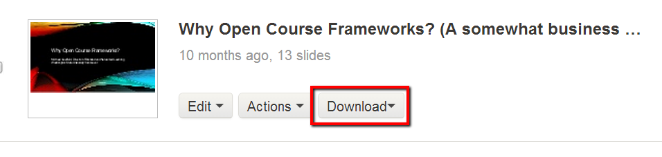 Slideshare has been good to me. Outside my surprise Latvian Top 40 hit, my “Slidecasts” (PowerPoints plus audio overlay) rank as some of my more popular productions. If the Slideshare analytics are to be believed, my combined presentations on Water 106 (I did a bunch) have been viewed collectively over 4,000 times. My presentation on Open Course Frameworks has another 1500 or so views.