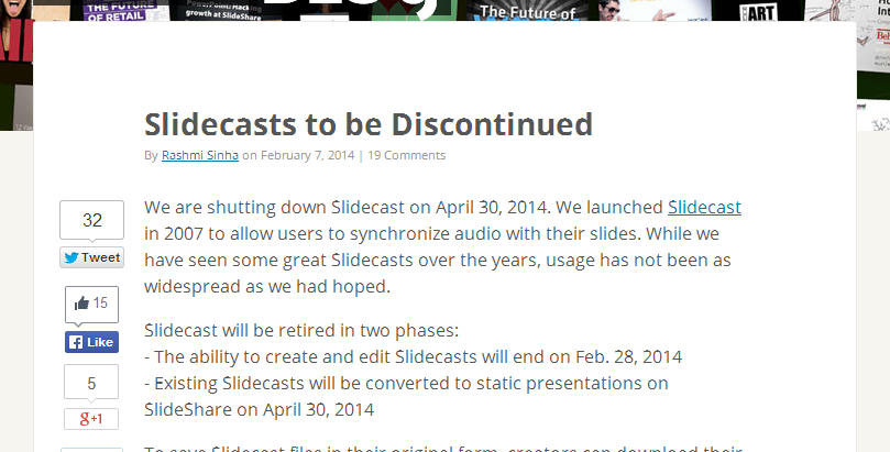 But today I’m doing that all too familiar dance of “downloading my stuff before the third party service deletes it”. Slideshare is discontinuing Slidecasts, and has tossed my stuff out on the street for me to collect, in true rom-com breakup style.