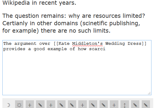 Today I’m looking over my Recent Changes in the wiki, and I see these two articles written over the past week — Wikipedia’s Logistic Curve and Kate Middleton’s Dress. And it occurs to me that Kate Middleton’s Dress is the perfect example of how Wikipedia creates a resource scarcity by limiting the subject matter of the encyclopedia to “things Wikipedia has historically covered”. As Wikipedia grows, omission moves from opportunity (“let me write that”) to evidence of canon (“we don’t do that here”).