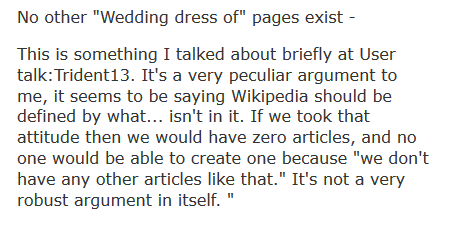 Then yesterday I wrote something about the whole Kate Middleton Wedding Dress Wikipedia fiasco. Back when Kate Middleton was marrying Prince William a Wikipedian posted a page on Kate Middleton’s dress. Within 16 minutes a prominent Wikipedian had flagged the article for deletion. A fight then ensued about whether the dress was notable enough — despite the fact that it was probably the most talked about dress in the history of mankind. The incident is generally seen as a prime example of the male-tech-geek-centrism of Wikipedia — as Jimmy Wales said when he stepped into the talkpage conversation — we have a hundred articles on different Linux distros, and we can’t have one article on a dress?