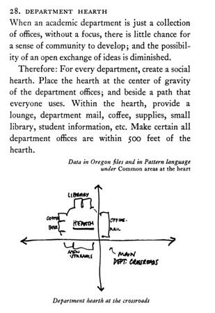 Here’s a different kind of pattern called Department Hearth. And there’s a community value here that we want to facilitate discussion among people working together. And that’s run through an empirical finding that space matters — people talk to each other more when we engineer chance meeting. So buildings have to accommodate that.