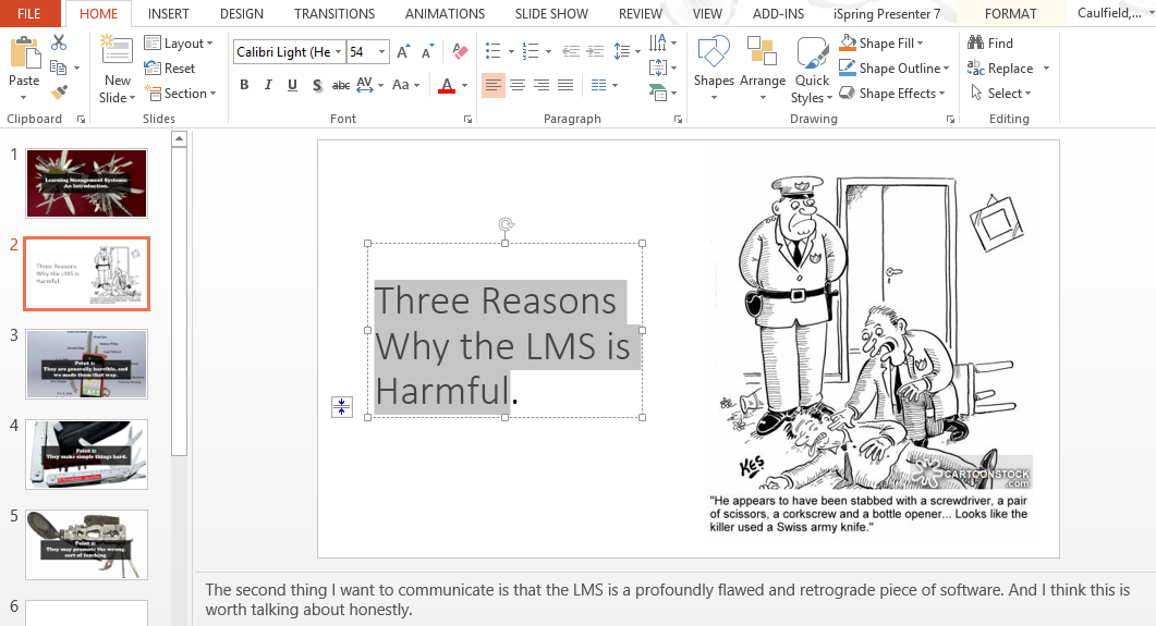 That toolbar is really a list of ways to make this content unusable by someone else. Bold stuff, position it in pixel-exact ways. Layer stuff on top of other stuff. Set your text alignment for each object individually. Choose a specific font and font-size that makes the layout work just right (let’s hope that font is on the next person’s computer!). Choose a text color to match the background of your slides, because all people wanting to reuse this slide will have the same color background as you. Mark it up, lay it out, draw shapes that don’t dynamically resize, shuffle the z-index of elements. Get the text-size perfect so that you can’t add or subtract a bullet point without the layout breaking.