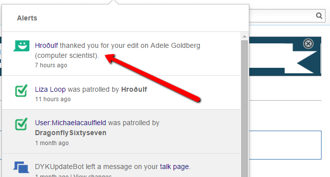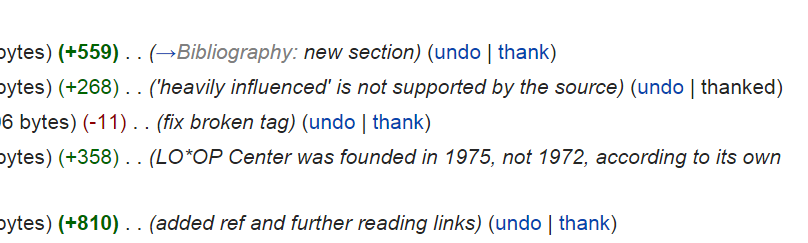 Here this person thanked me for finding an Adele Goldberg photo. They then went to my Liza Loop article and disagreed with a claim of mine, saying the source cited didn’t support the strong claim. Without the thank, it would be easy to think of this person as some opponent, out to undo my work. The thank changes things. Consequently, when I review their edit on the Liza Loop article, and it’s persuasive enough, I thank them back. I *want* more people working on these articles — people making sane edits and revision is a *good* thing, because over time it will improve the quality.