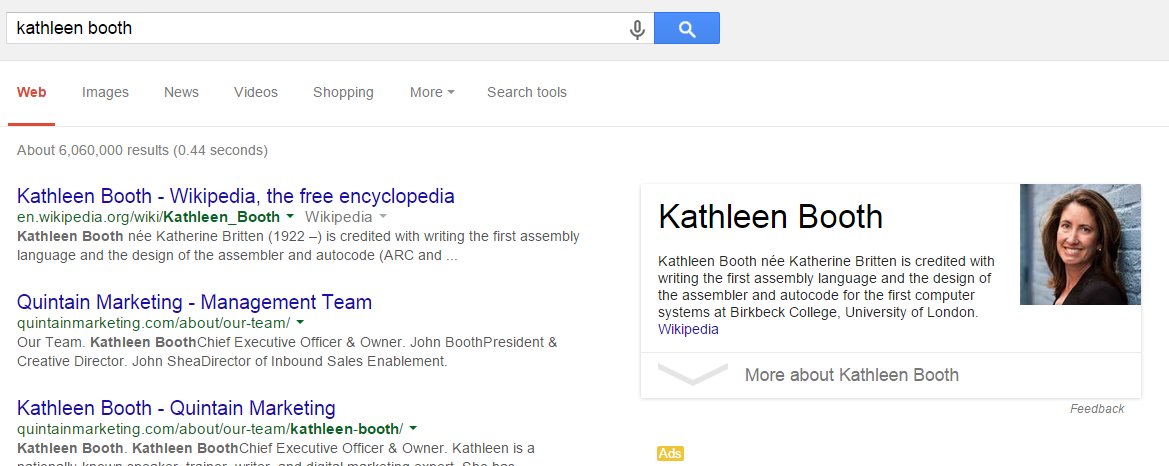 That lack of effort in these areas is why when you google Kathleen Booth (born 1922) you are greeted with this incongruous Google supplied Twitter photo that is actually the CEO of a small marketing firm. If Wikipedia had a photo in there, Google would pull it. But they don’t so they guess and this is the result: