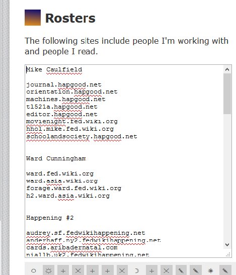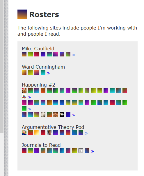 Rosters are ways to organize all the sites you read. Up at the top you can see I write or have written eight or so sites I might want to being into my search neighborhood, in a “I know I wrote something about that somewhere” sort of way. I’m also watching Ward Cunningham’s writings on the four sites of his I care about (but not, for example, watching his sites on programming issues).