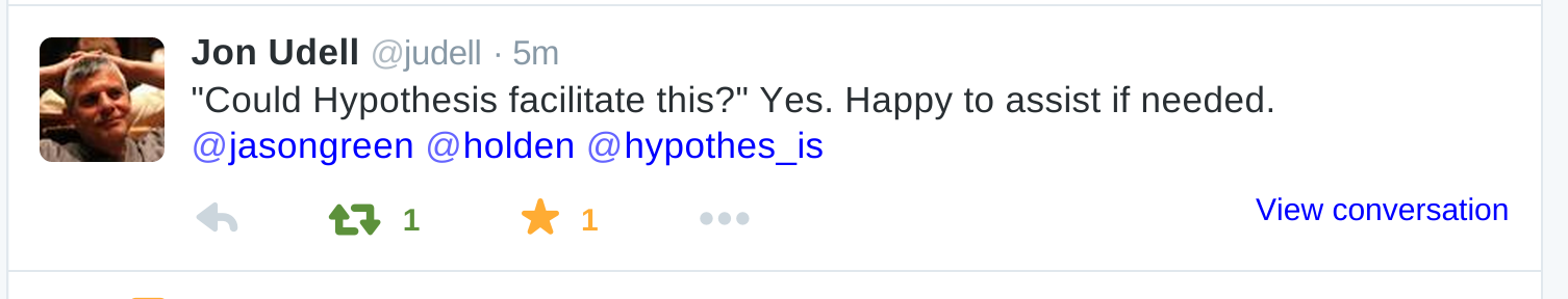 The way the resuse incentive could work is this — if multiple people link the page from multiple other pages, the annotation floats to the top and a visual indicator shows that this page is in general use, not just an extended ranty reply to the post. If multiple people link it, but all form this page, it shows it’s considered a useful reply, but maybe specific. If one person links it and only from this page, it’s maybe a comment.
