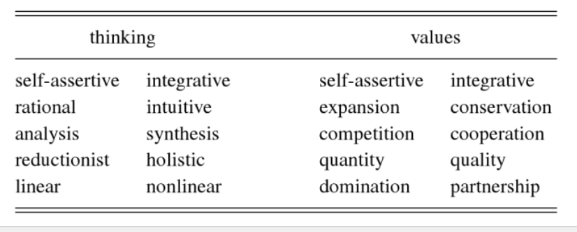 In our brief summary of the emerging systems view of life in the Preface, we have emphasized shifts in perceptions and ways of thinking. However, the broader paradigm shift also involves corresponding changes of values. And here it is interesting to note a striking connection between the changes of thinking and of values. Both of them may be seen as shifts from self-assertion to integration. These two tendencies — the self-assertive and the integrative — are both essential aspects of all living systems, as we discuss in Chapter 4 (Section 4.1.2). Neither of them is intrinsically good or bad. What is good, or healthy, is a dynamic balance; what is bad, or unhealthy, is imbalance — overemphasis on one tendency and neglect of the other. When we look at our modem industrial culture, we see that we have overemphasized the self-assertive and neglected the integrative tendencies. This is apparent both in our thinking and in our values. It is very instructive to put these opposite tendencies side by side.