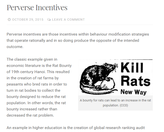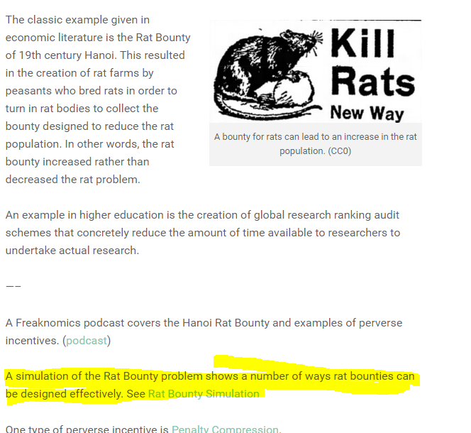 The article describes the effects of this weird market economy for rat tails in turn-of-20th-century Hanoi. A “rat bounty” for rat tails (designed to decrease the rat population) perversely led some enterprising locals to breed rats for their tails, and others to chop off rat tails while letting them live, all of which increased the rat population there.