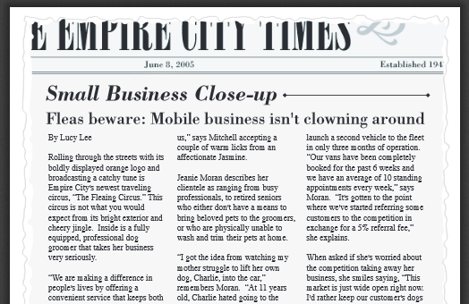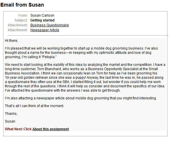 You can see the resources attached. These are meant to be realistic resources from which the student has to gather relevant information. For instance, there’s an article on the mobile dog grooming trend. Buried in the articles are hints on the consumer profile, level of demand, and competition.
