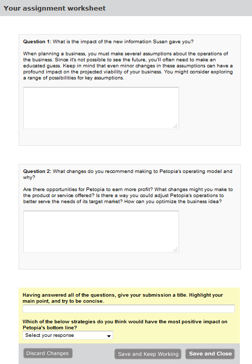 As you progress through the each scenario operation, you submit your work to your peers in the class to evaluate. You are frequently submitting an artifact (spreadsheet, etc), but after submission you are asked to reflect on your decisions and defend them.
