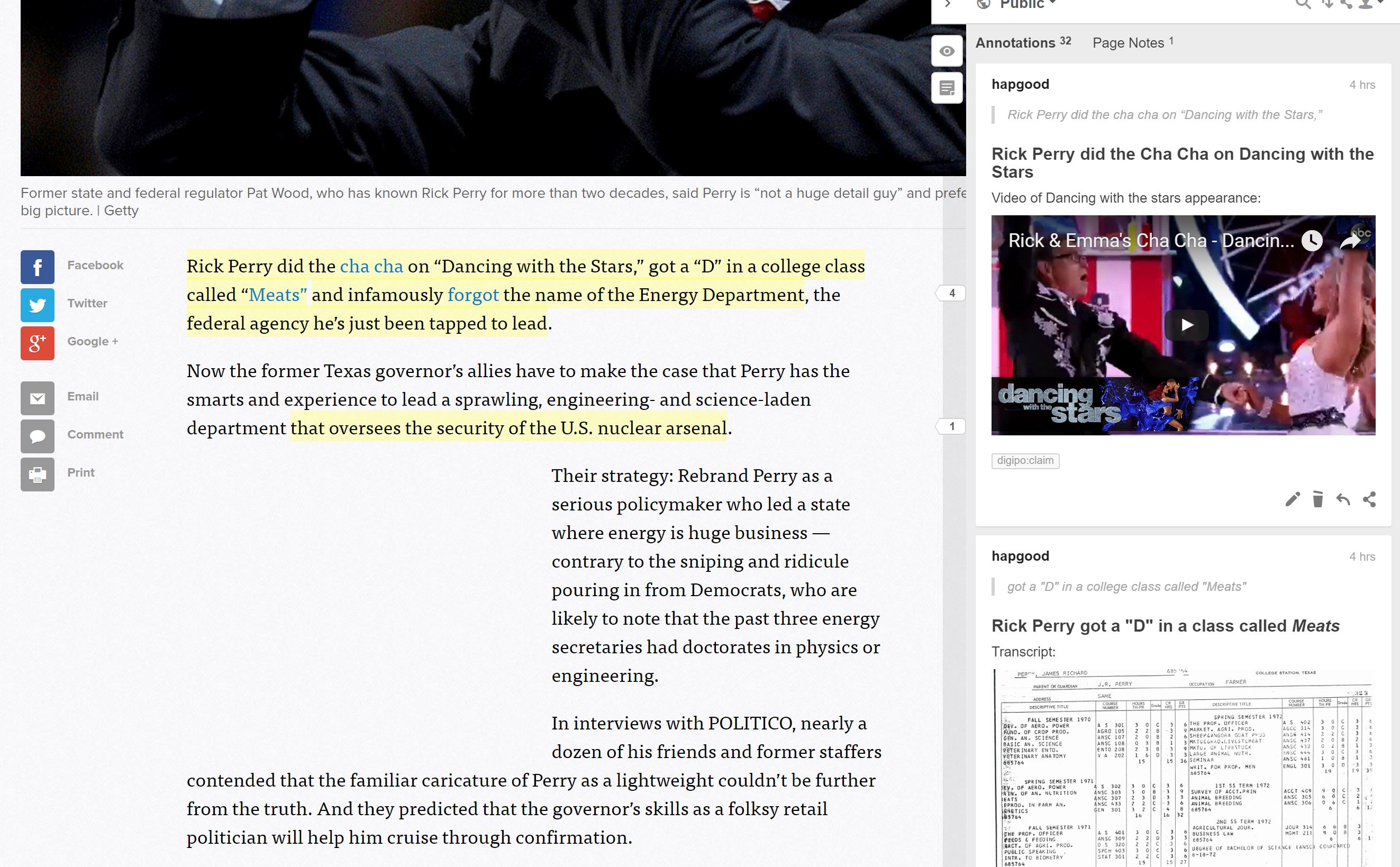 So, for example, the article says that Rick Perry did the Cha-Cha on Dancing with the Stars. We check that Perry actually got a “D” in a class called “Meats”. We verify that the Energy Department oversees the nuclear arsenal.