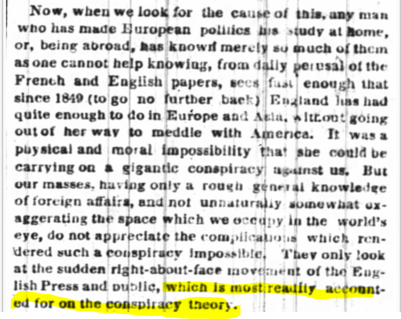 However, unless I’m missing something, most of this is wrong. The first mention found in newspapers is in 1863, not the 1870s, and it does not come out of court terminology, but rather politics. In fact it is used much as it would be today, to derisively refer to a set of allegedly less educated people who see a secret plot when a simple non-conspiratorial narrative has much more explanatory power.