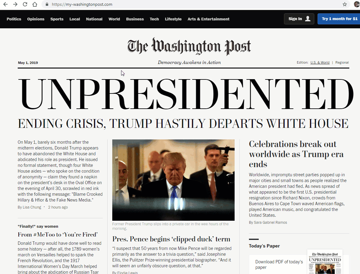 So today a group known for pranks circulated an imposter site that posed as the Washington Post, announcing President Trump’s resignation on a post-dated paper. It’s not that hard for hoaxers to do this – any one can come up with a confusingly similar url to a popular site, grab some HTML and make a fake site. These sites often have a short lifespan once they go viral — the media properties they are posing as lean on the hosters who pull the plug. But once it goes viral the damage is done, right?