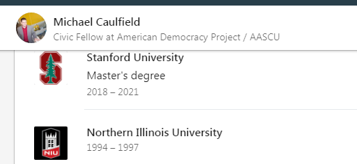 First, the education field in LinkedIn is no more authoritative than the bio field in Twitter. It’s user supplied, even though it looks official. Hey, look, I just got into Stanford too! My new degree in astrophysics is going to rock.