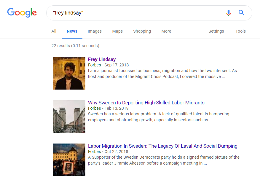 Let’s do the same with a reporter from the BBC who just contacted me. Here’s a Google News Search. First a bunch of Forbes stuff: