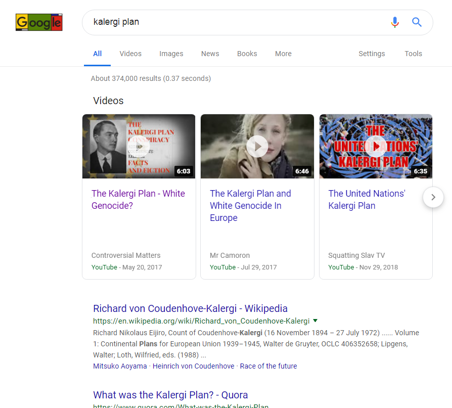 So what you get is what researchers call a “data void“: people who know anything about the history of Europe, immigration, etc. don’t talk about Kalergi, because he is insignificant, a figure most notable for the conspiracy theories built around him. But people using the conspiracy theory talk about Kalergi quite a lot. So when you search Kalergi Plan, almost all the information you get will be by white supremacist conspiracy theorists.