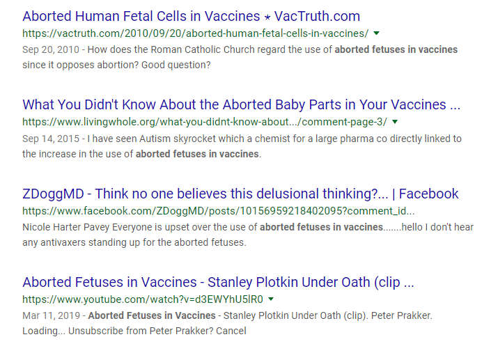 Selected Google results for “Aborted fetuses in vaccines”. It’s a tire fire.