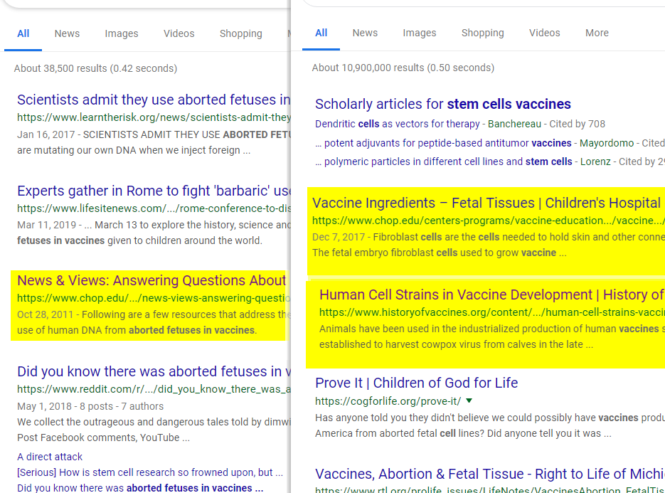 This isn’t to say that a better search term gets you great results, especially around issues that are conspiracy-adjacent. But a better search term may at least return a set of results with some good pages listed. Here are the top results for a bad search ([[“aborted fetuses in vaccines”]] on the left), and ([[stem cells vaccines]]) on the right.