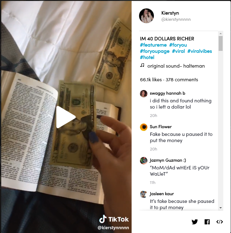 These sort of fake hacks work on multiple levels in TikTok. In cases like the bible cash, they are sort of Santa Claus-ish: a group of people in the know bonds around these knowing these are fake, but enjoying and sometimes sustaining the joke through through faking evidence, the way parents fake Santa Claus eating cookies on Christmas. Another group of people believes the hacks are real, and a larger group enjoys wondering if they are real or not in a way that makes the world a bit more magical. It’s really not harmful if people flip through their bibles in hotel rooms and experience some brief anticipation of a cash find. (It’s also spawned some interesting variations where people put non-cash fandom-related things in hotel bibles.)