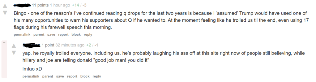 Still banned from Twitter (over a dumb mistake their algorithm made), so I’ll just put this here — I am finding it really hard to figure out if some of these QAnon groups are really rifting at the moment over things not playing out as they were told or if the groups have been infiltrated by normies posing as disaffected QAnon supporters. I think honestly it’s a bit of both, I just don’t know the ratio.