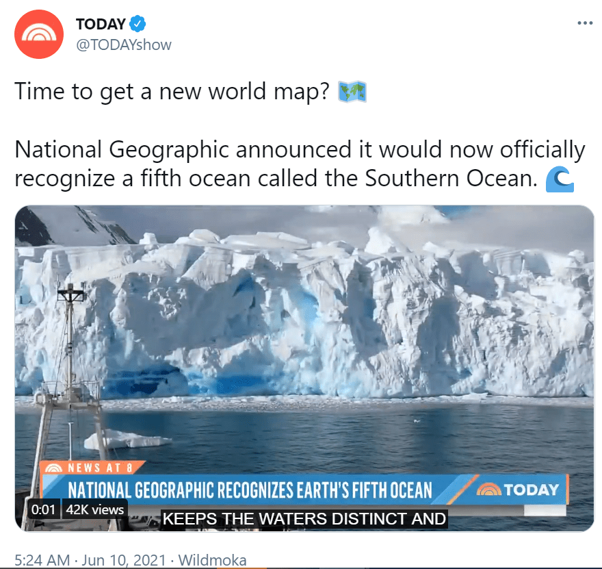 Today’s activity revolves around a tweet that National Geographic (through the Society) has recognized a fifth ocean. I use this tweet here as a jumping off point, but if you want to run it in in another platform you can find examples anywhere.